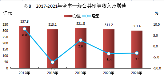 全年一般公共预算收入301.64亿元,下降3.1%。地方一般公共预算收入179.82亿元,下降12.1%,其中,市本级完成41.3亿元,下降30%;县(市)级完成65.75亿元,增长1.4%;区级完成72.76亿元,下降9.9%。全市各项税收总收入249.92亿元,增长6.5%,占一般公共预算收入比重为82.9%,地方税收收入128.1亿元,占地方一般公共预算收入比重为71.2%。