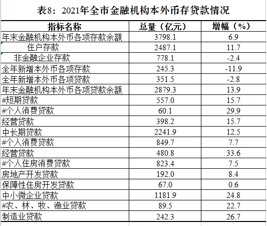 年末,金融机构本外币存款余额3798.1亿元,比上年末增长6.9%。其中,住户存款余额2487.1亿元,增长11.7%;非金融企业存款余额778.1亿元,下降2.4%。金融机构本外币贷款余额2879.3亿元,增长13.9 %。余额存贷比为75.8%。