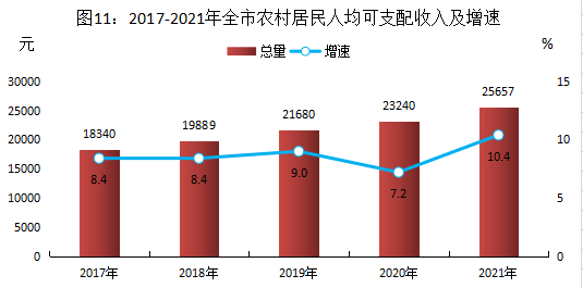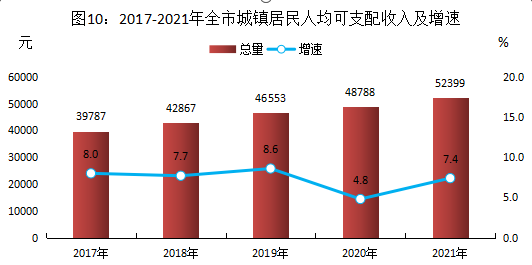 全年城乡居民人均可支配收入42402元,增长8.2%。城镇居民人均可支配收入52399元,增长7.4%,其中,工资性收入29618元,经营净收入6711元,财产净收入5307元,转移净收入10764元。农村居民人均可支配收入25657元,增长10.4%,其中,工资性收入11201元,经营净收入7801元,财产净收入1065元,转移净收入5589元。城乡居民收入比为2.04:1。全年城乡居民人均消费支出27031元,增长8.2%。城镇居民和农村居民人均消费支出分别为30987元和20406元。城乡居民恩格尔系数为27.6%。
