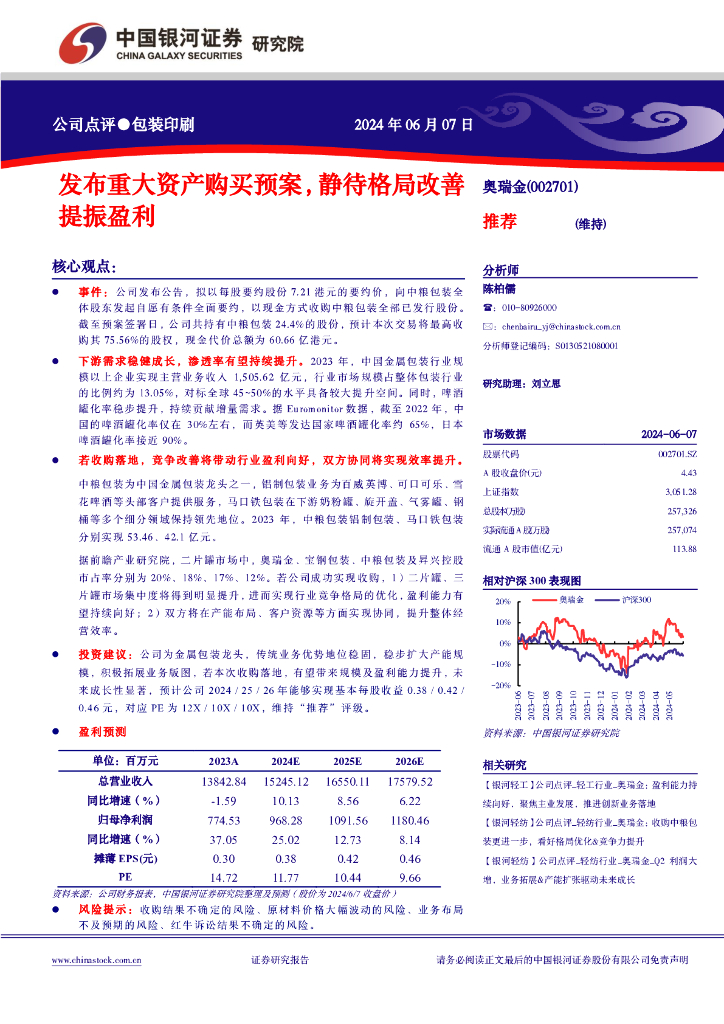 中国银河:奥瑞金(002701)-发布重大资产购买预案,静待格局改善提振盈利.pdf