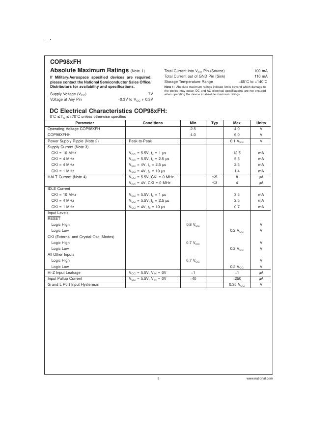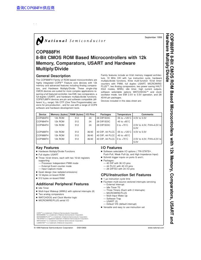 National Semiconductor COP888FH 8-Bit CMOS ROM Based Microcontrollers with 12k Memory, Comparators, USART and Hardware Multiply/Divide 数据手册.pdf