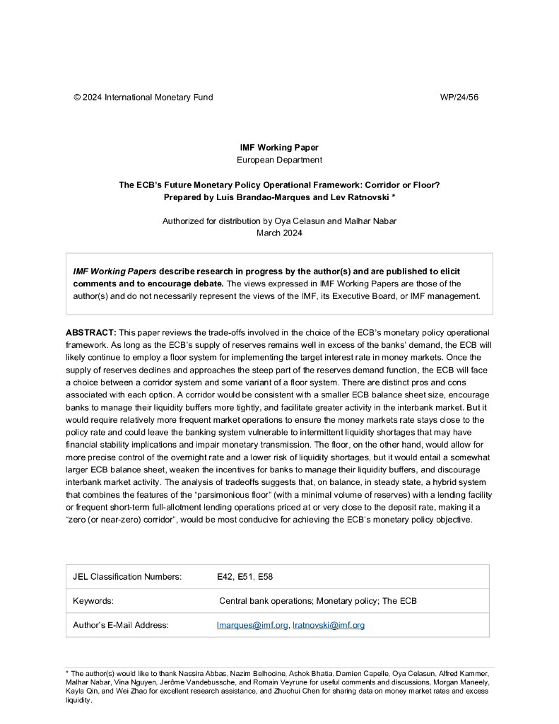 国际货币基金组织:2024欧洲央行未来货币政策操作框架报告:走廊还是底线(英文版).pdf