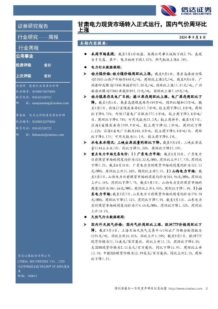 信达证券:公用事业—电力天然气周报:甘肃电力现货市场转入正式运行,国内气价周环比上涨.pdf