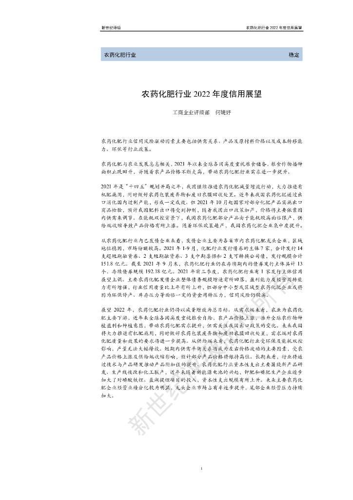 新世纪评级:农药化肥行业2022年度信用展望.pdf