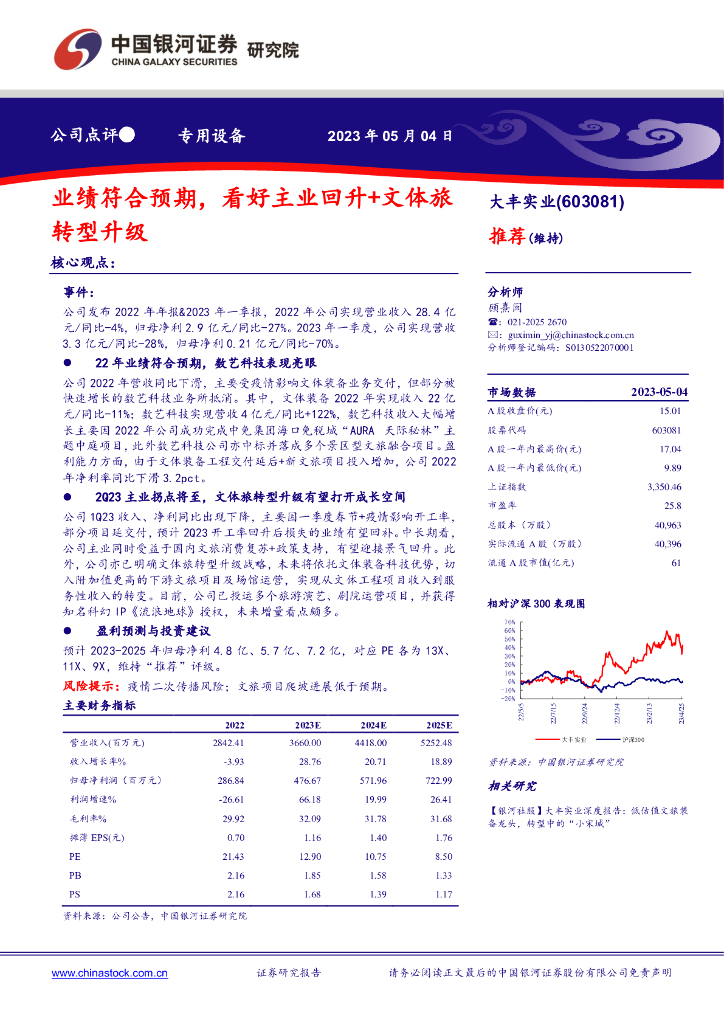 中国银河:大丰实业(603081)-业绩符合预期,看好主业回升+文体旅转型升级.pdf