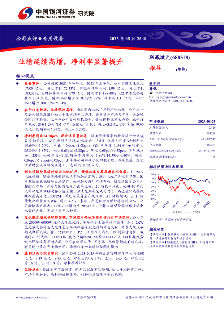 中国银河:联赢激光(688518)-业绩延续高增,净利率显著提升.pdf