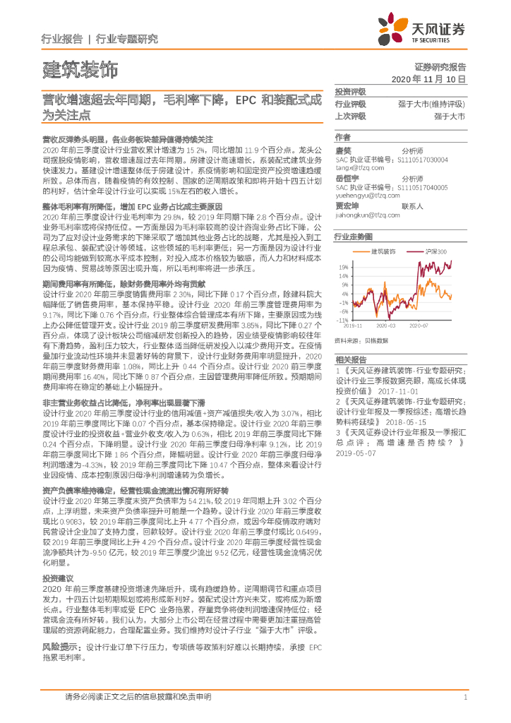天风证券:建筑装饰行业专题研究:营收增速超去年同期,毛利率下降,EPC和装配式成为关注点.pdf