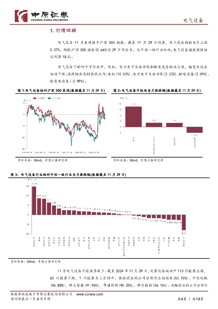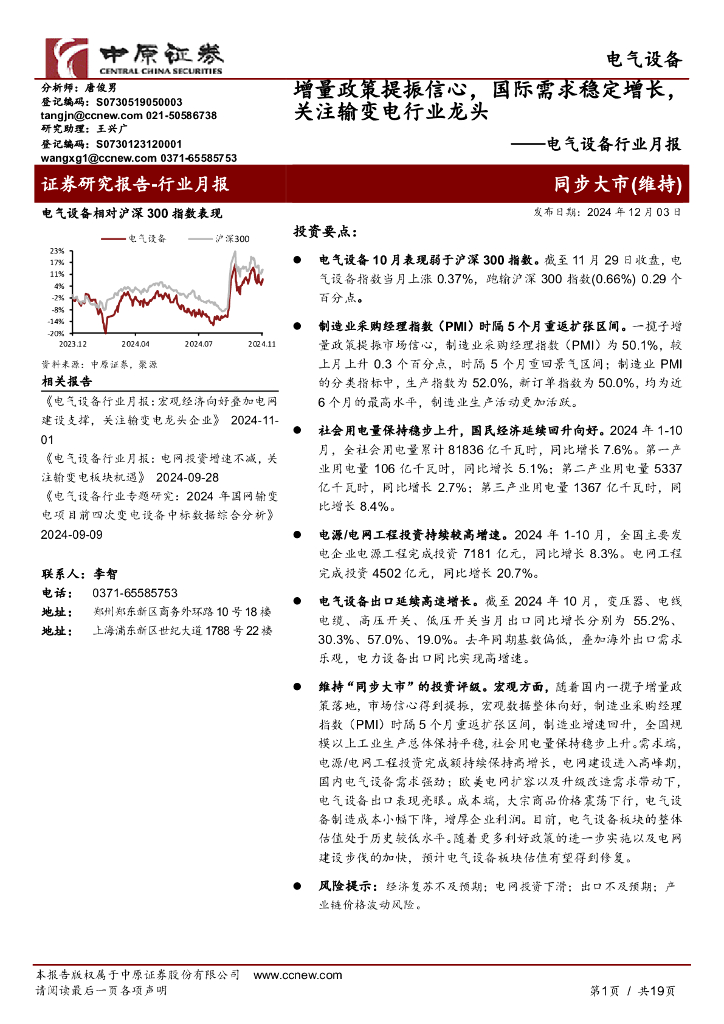 中原证券:电气设备行业月报:增量政策提振信心,国际需求稳定增长,关注输变电行业龙头.pdf