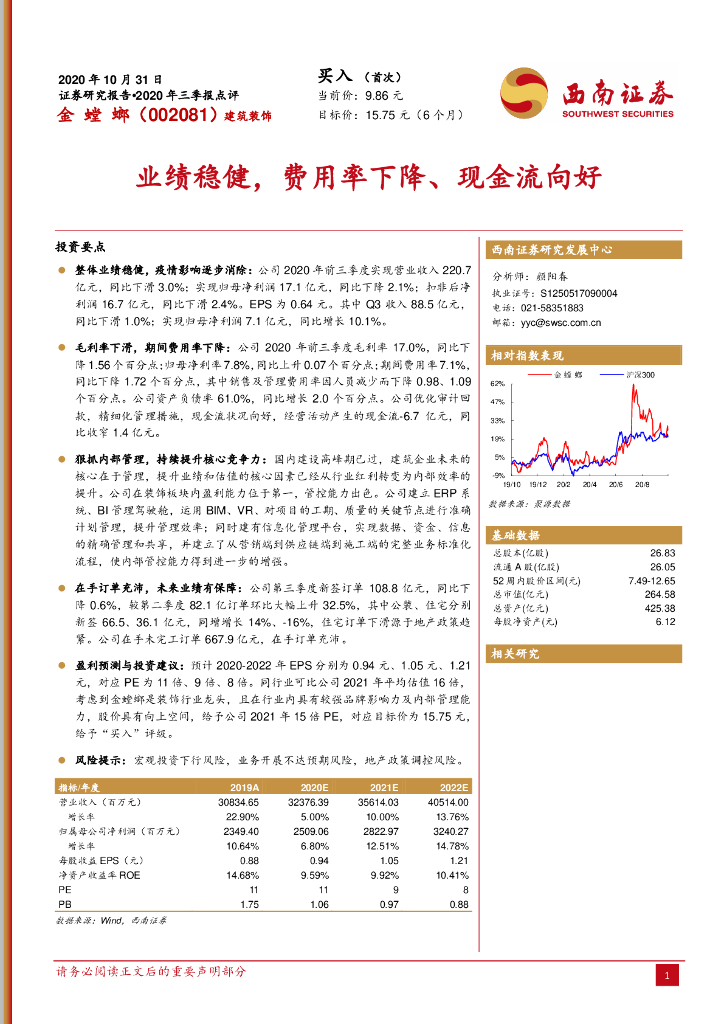 西南证券:金螳螂(002081)-2020年三季报点评:业绩稳健,费用率下降、现金流向好.pdf