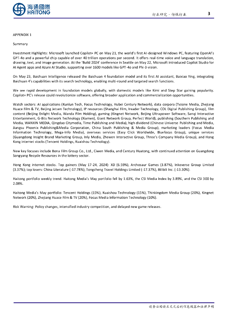 海通国际:传媒行业周报:微软发布Copilot+PC,引领AIPC发展,看好AI应用加速落地.pdf