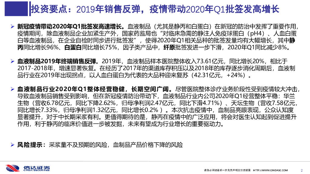 信达证券:专题报告:血液制品2020年Q1批签发及2019销售分析.pdf
