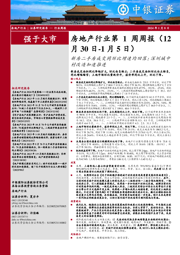 中银证券:房地产行业第1周周报:新房二手房成交同环比增速均回落;深圳城中村改造加速推进.pdf