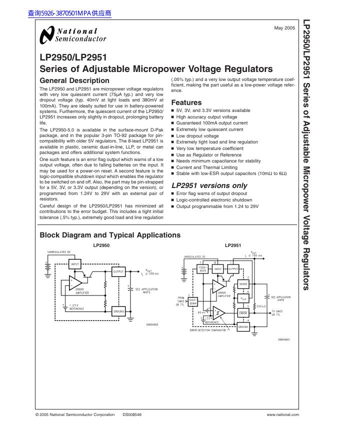 National semiconductor LP2950/LP2951 Series of Adjustable Micropower Voltage Regulators 说明书.pdf