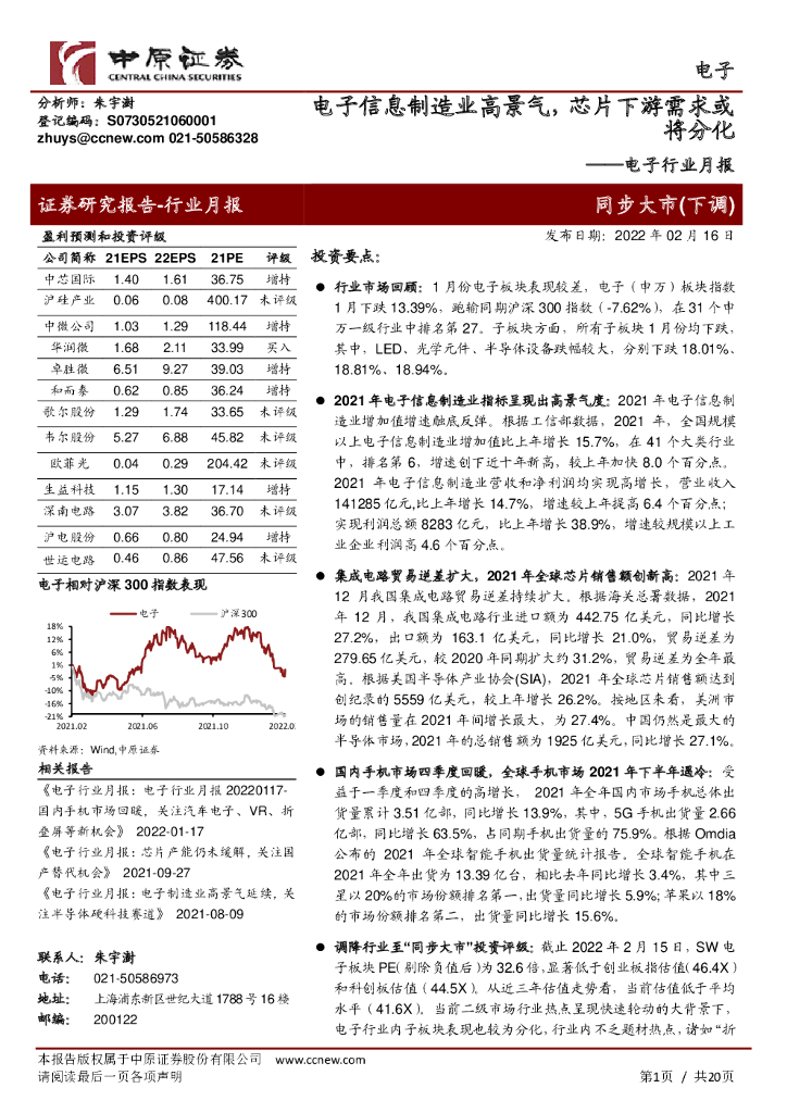 中原证券:电子行业月报:电子信息制造业高景气,芯片下游需求或将分化.pdf