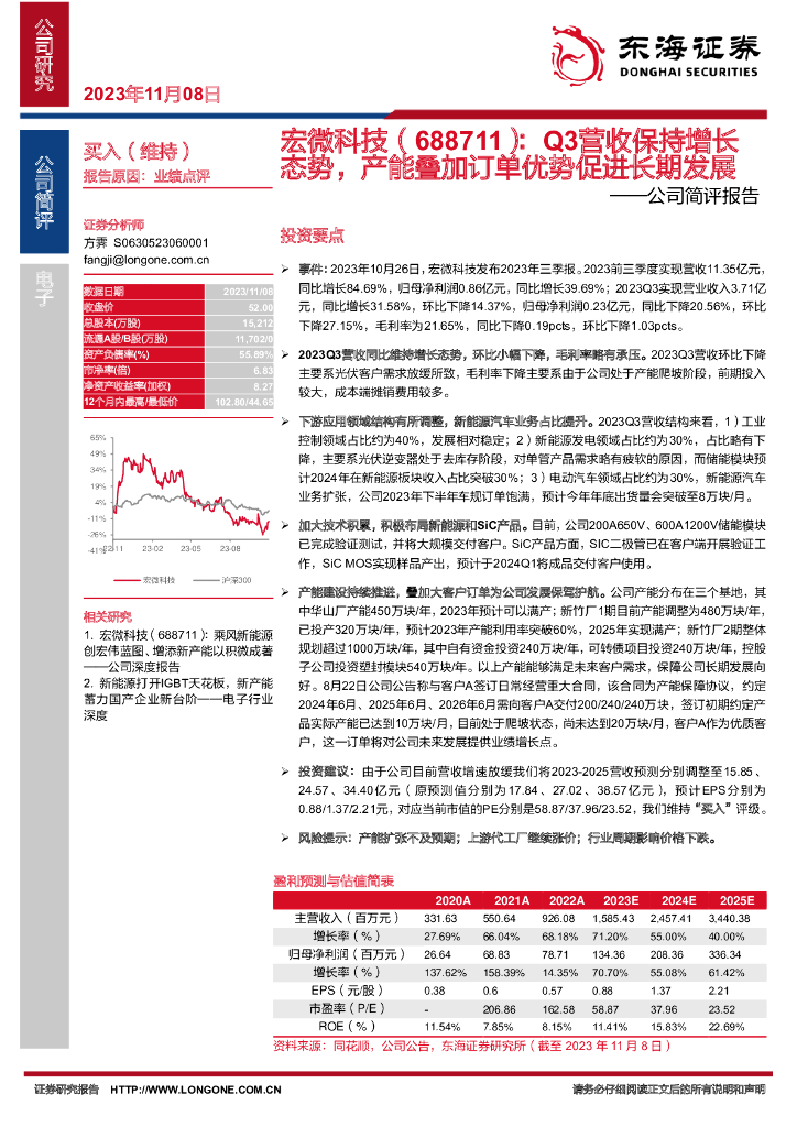东海证券:宏微科技(688711)-公司简评报告:Q3营收保持增长态势,产能叠加订单优势促进长期发展.pdf