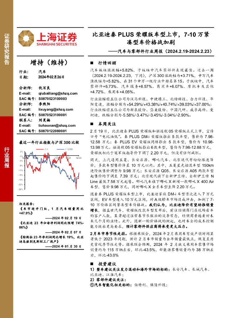 上海证券:汽车行业周报:比亚迪秦PLUS荣耀版车型上市,7-10万紧凑型车价格战加剧.pdf