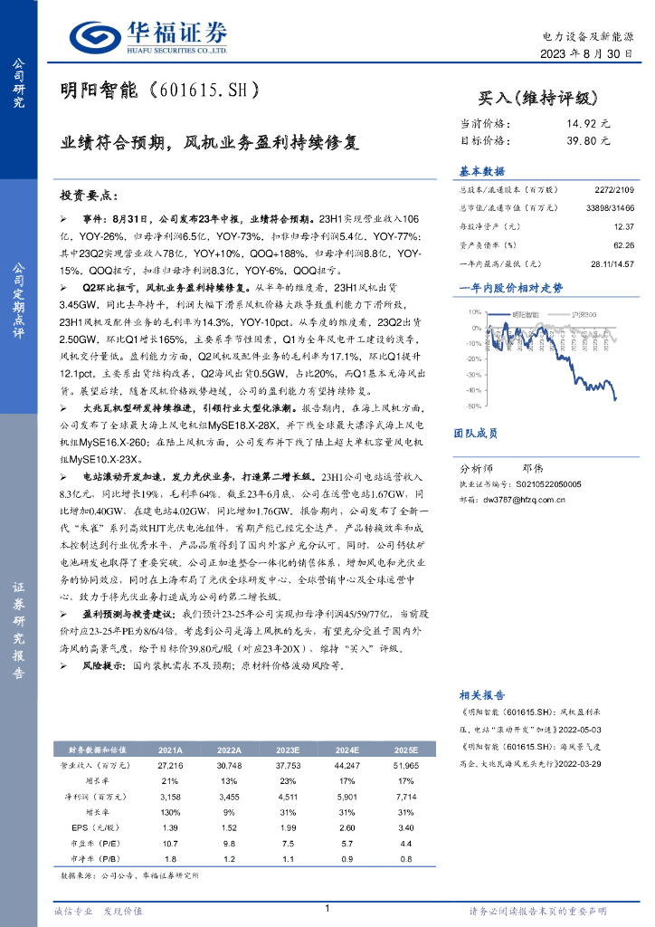 华福证券:明阳智能(601615)-业绩符合预期,风机业务盈利持续修复.pdf