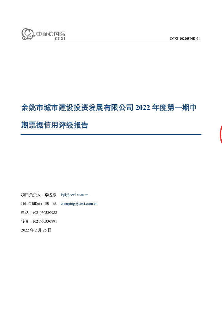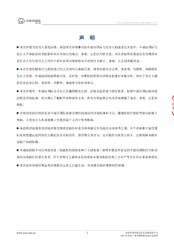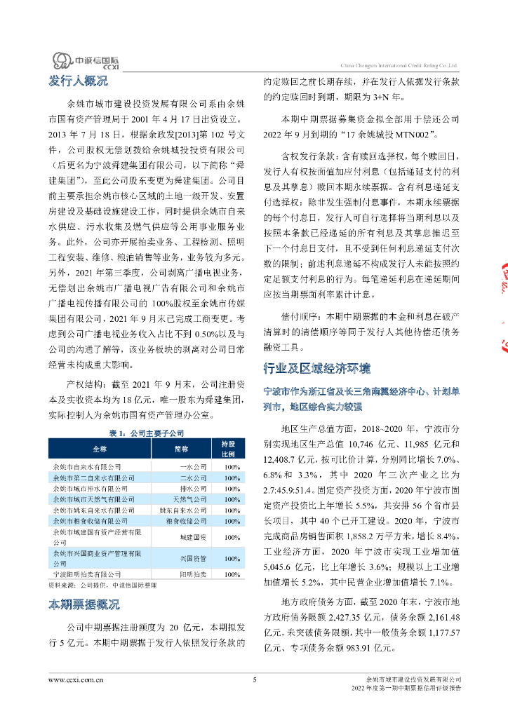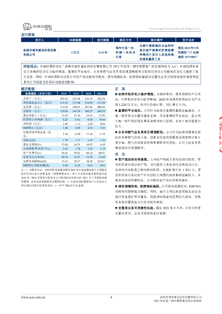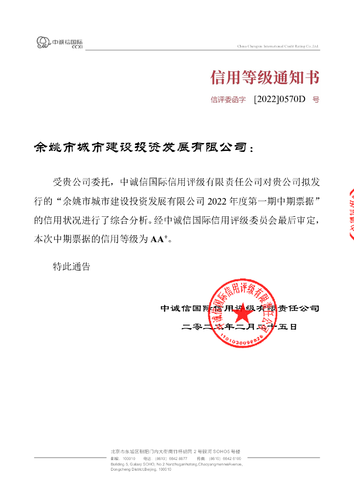 中诚信:余姚市城市建设投资发展有限公司2022年度第一期中期票据信用评级报告.pdf