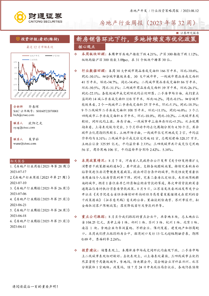 财通证券:房地产行业周报(2023年第32周):新房销售环比下行,多地持续发布优化政策.pdf