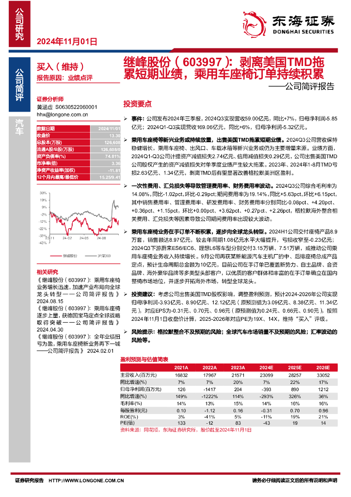 东海证券:继峰股份(603997)-公司简评报告:剥离美国TMD拖累短期业绩,乘用车座椅订单持续积累.pdf