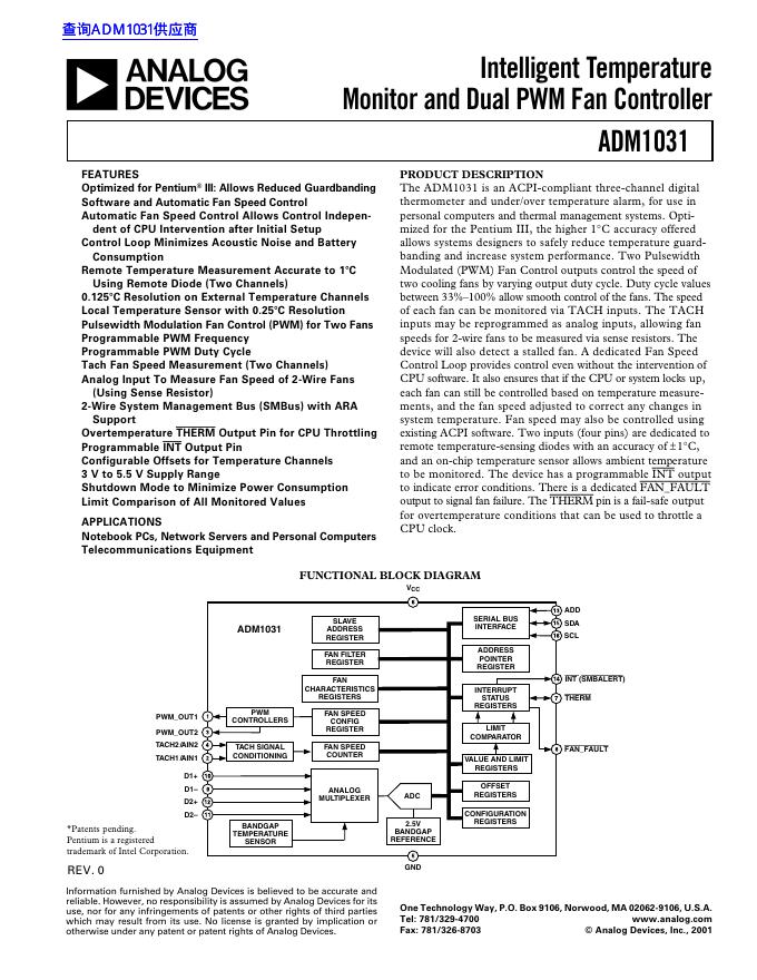 ANALOG DEVICES ADM1031 Intelligent Temperature Monitor and Dual PWM Fan Controller 数据手册.pdf