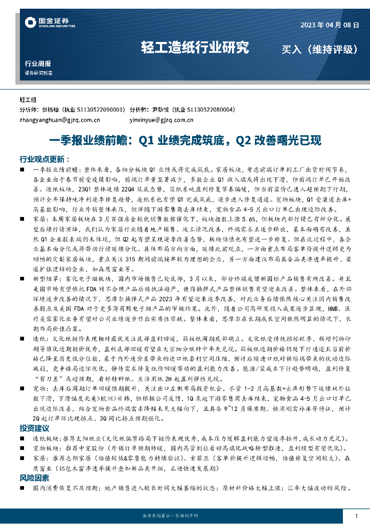 国金证券:轻工造纸行业周报:一季报业绩前瞻:Q1业绩完成筑底,Q2改善曙光已现.pdf