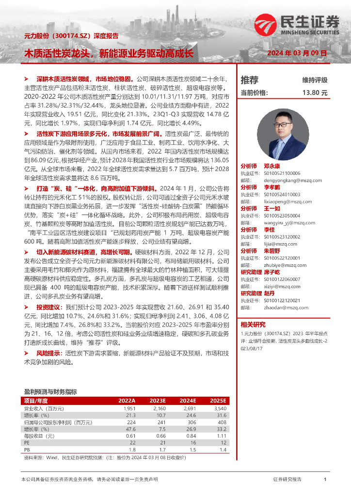 民生证券:元力股份(300174)-深度报告:木质活性炭龙头,新能源业务驱动高成长.pdf