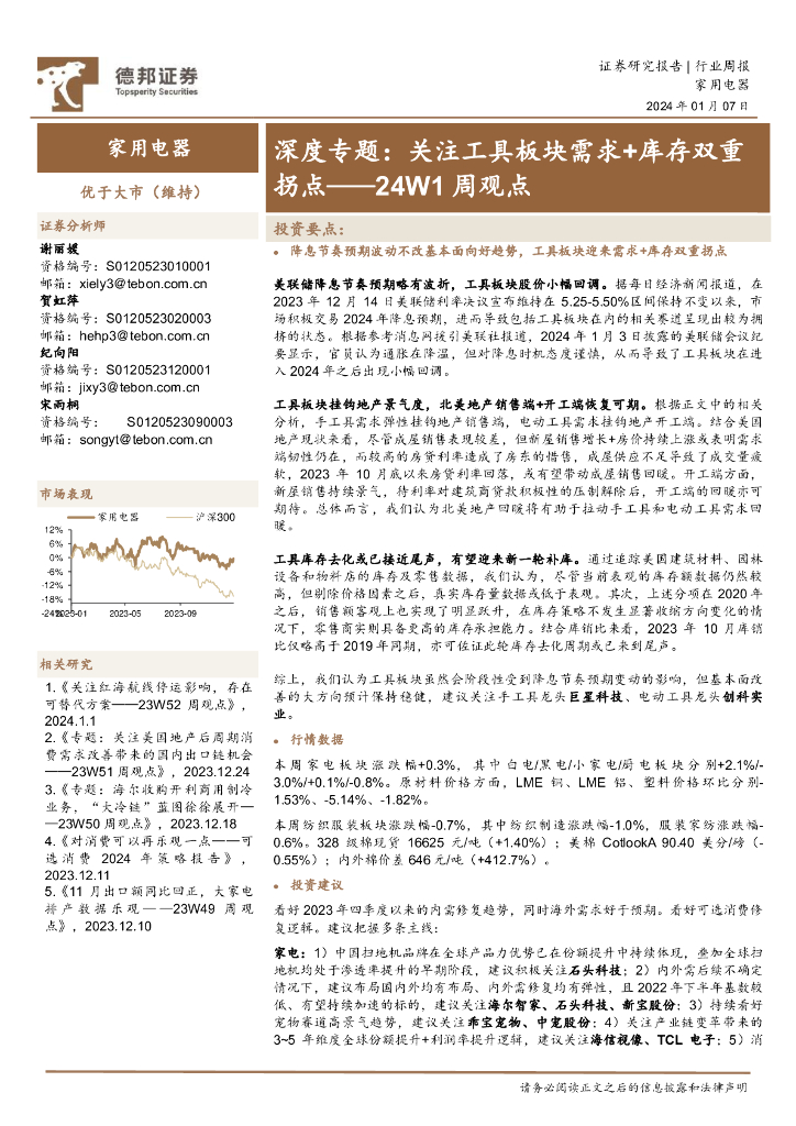 德邦证券:家用电器24W1周观点:深度专题:关注工具板块需求+库存双重拐点.pdf