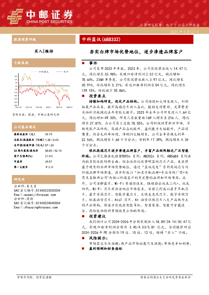 中邮证券:中科蓝讯(688332)-夯实白牌市场优势地位,逐步渗透品牌客户.pdf