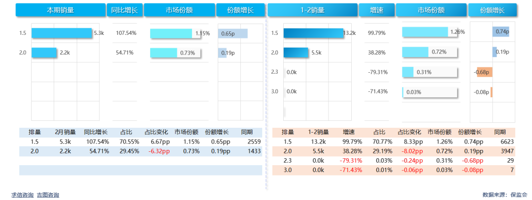 1.5排量车型比重较高,占比70.55%,销呈5311辆,同比增长107.54%,增速高于大市场,市场份额1.15%,份额较上年扩大0.65pp。2.0排呈车型销星占比29.45%,销量2217辆,同比增长54.71%,增速高于大市场,市场份额0.73%,份额较上年扩大0.19pp。