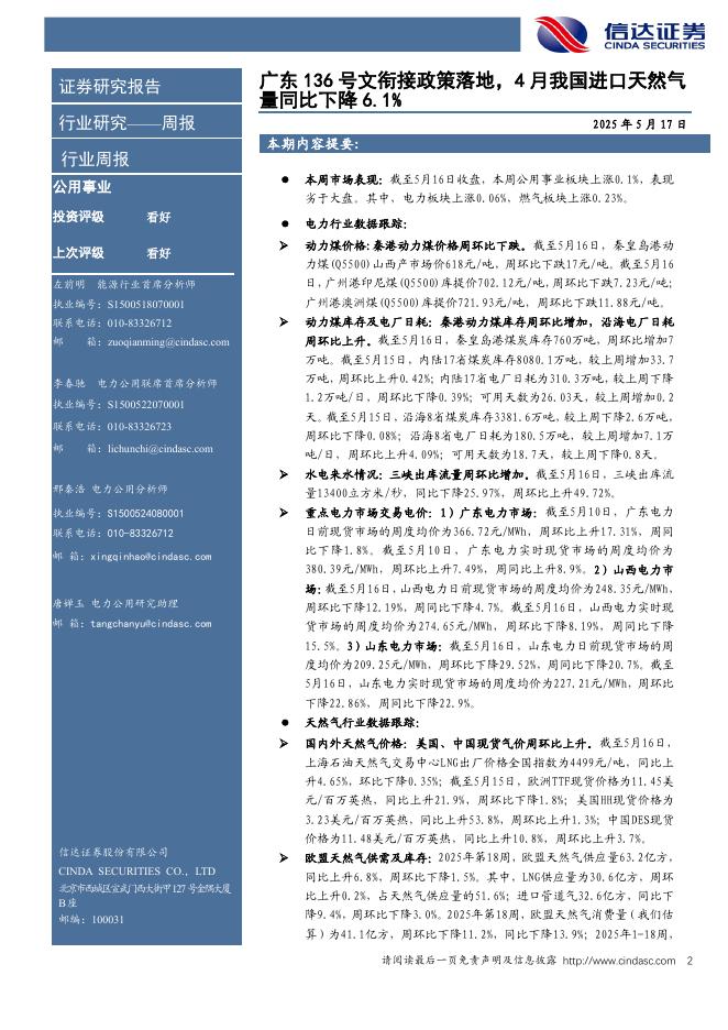 信达证券:公用事业—电力天然气周报:广东136号文衔接政策落地,4月我国进口天然气量同比下降6.1%.pdf