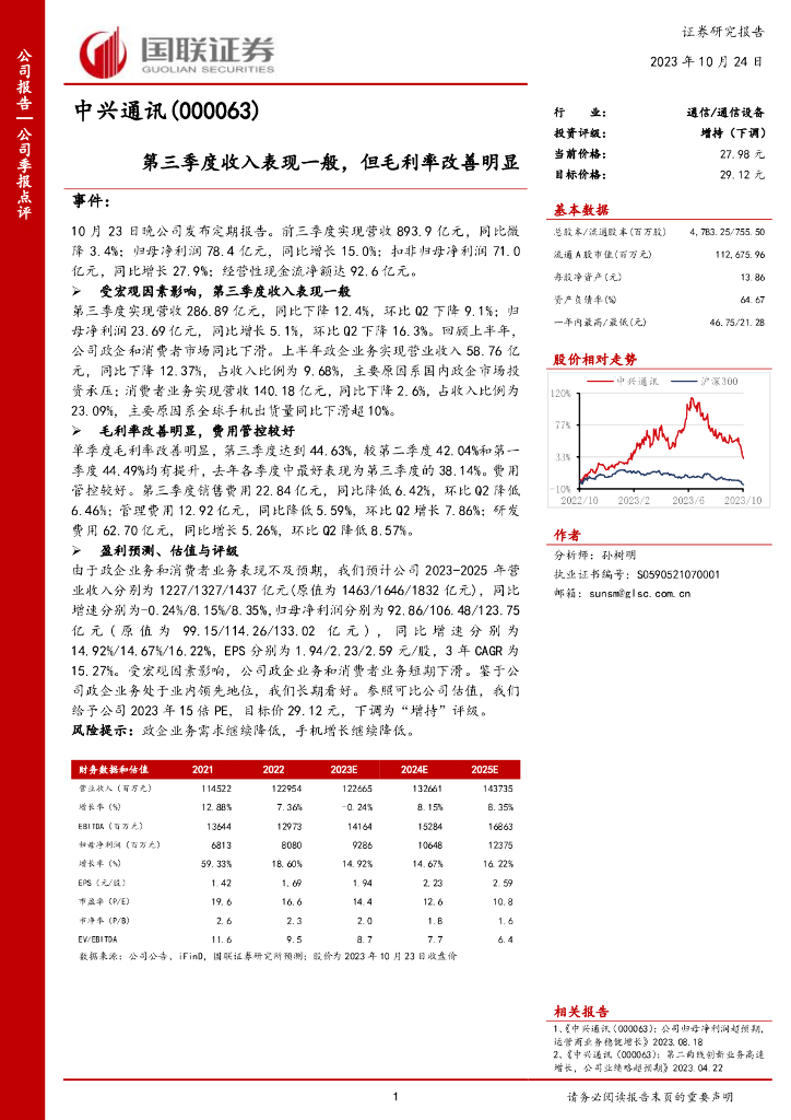 国联证券:中兴通讯(000063)-第三季度收入表现一般,但毛利率改善明显.pdf