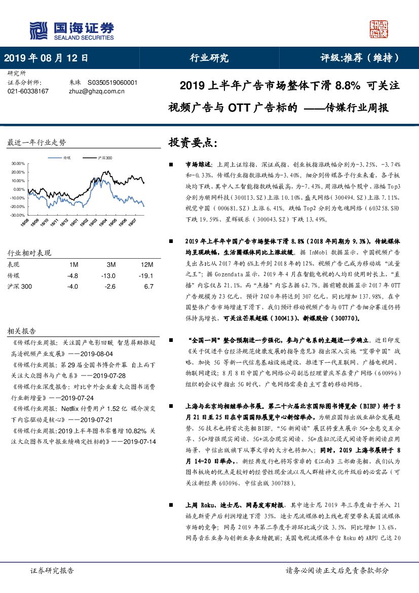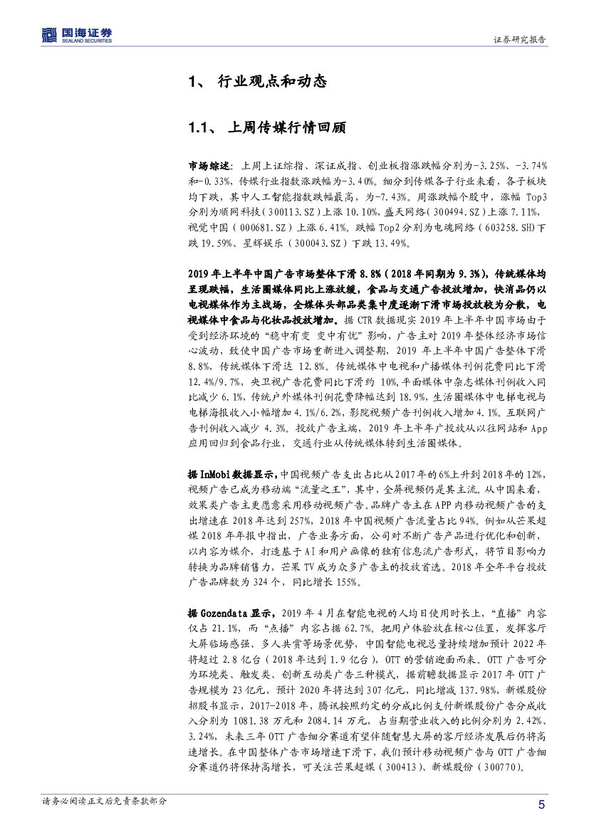 国海证券:传媒行业周报:2019上半年广告市场整体下滑8.8% 可关注视频广告与OTT广告标的.pdf