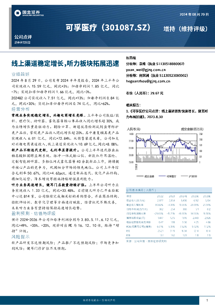 国金证券:可孚医疗(301087)-线上渠道稳定增长,听力板块拓展迅速.pdf
