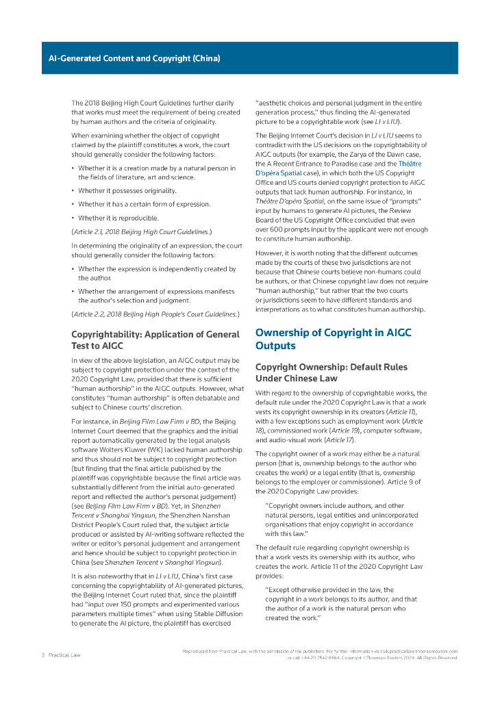 国际知名专业机构汤森路透(Thomson Reuters)旗下的Practical Law 近日发布了《生成式人工智能(AIGC)与版权:中国篇》(AI-Generated Content and Copyright (Chin">