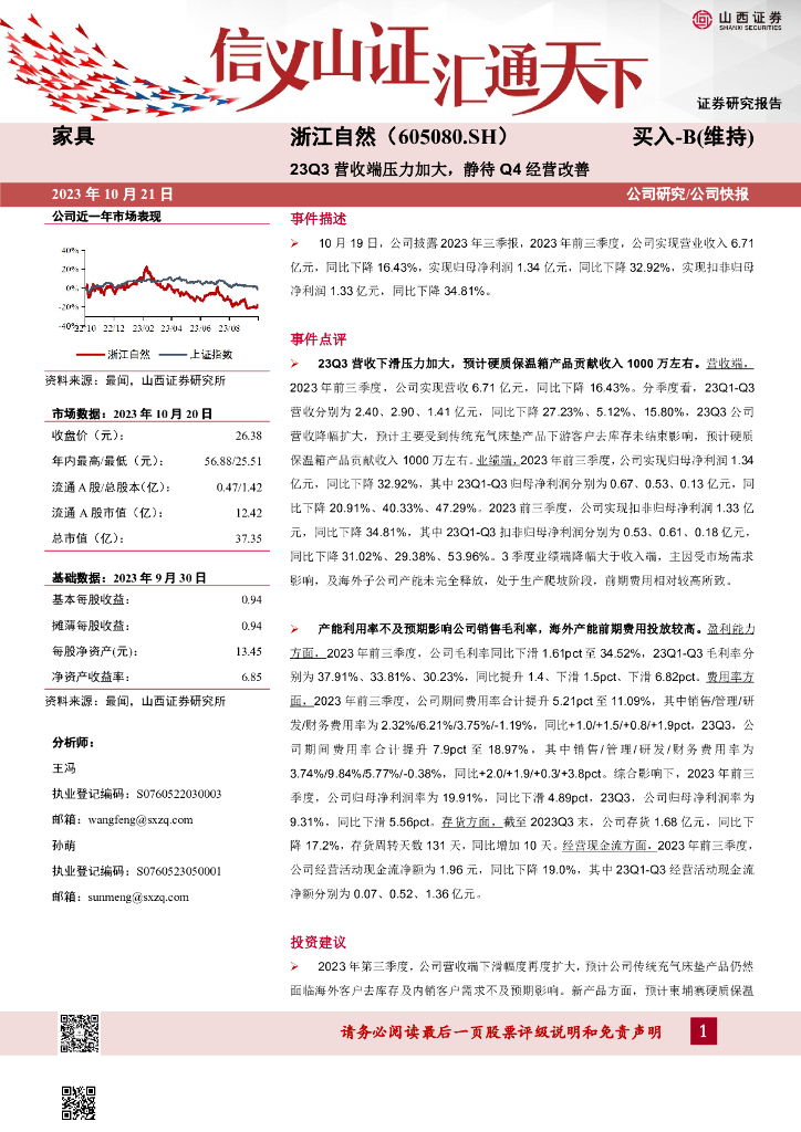 山西证券:浙江自然(605080)-23Q3营收端压力加大,静待Q4经营改善.pdf