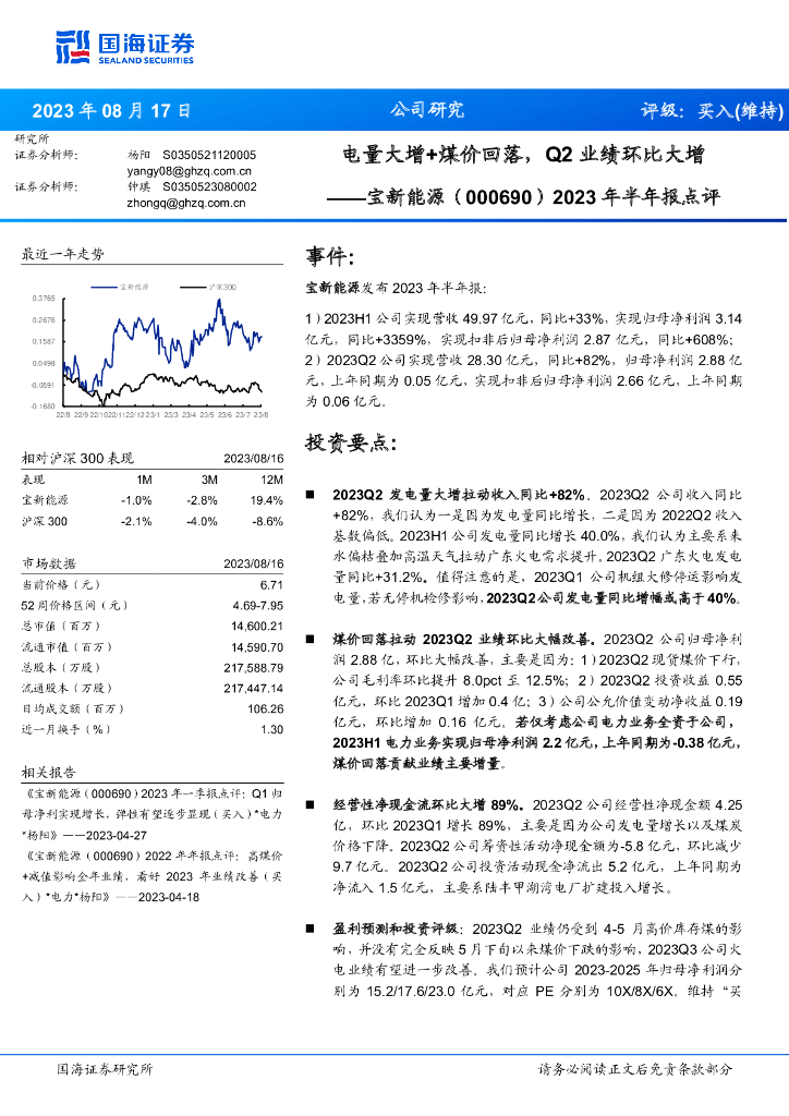 国海证券:宝新能源(000690)-2023年半年报点评:电量大增+煤价回落,Q2业绩环比大增.pdf