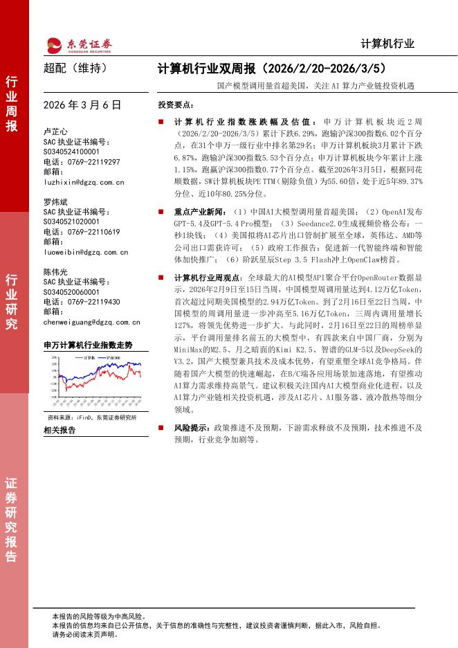 东莞证券:计算机行业双周报:国产模型调用量首超美国,关注AI算力产业链投资机遇.pdf