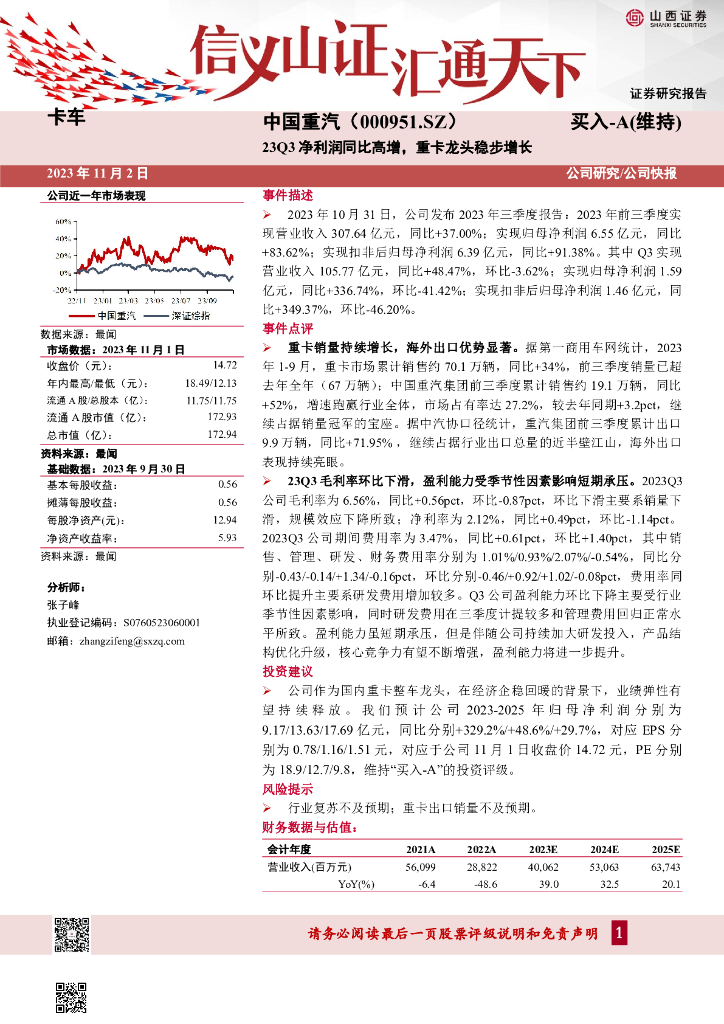 山西证券:中国重汽(000951)-23Q3净利润同比高增,重卡龙头稳步增长.pdf