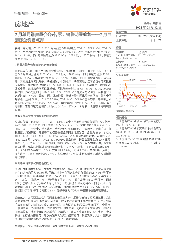 天风证券:房地产2月百强房企销售点评:2月单月销售量价齐升,累计销售明显修复.pdf