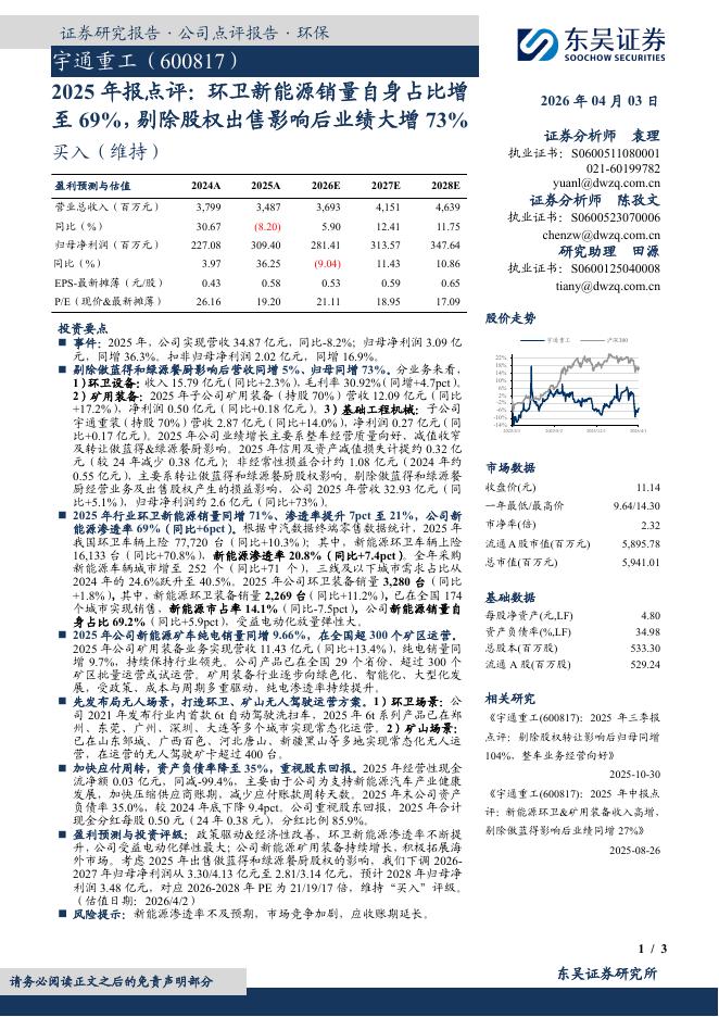东吴证券:宇通重工(600817)-2025年报点评:环卫新能源销量自身占比增至69%,剔除股权出售影响后业绩大增73%.pdf