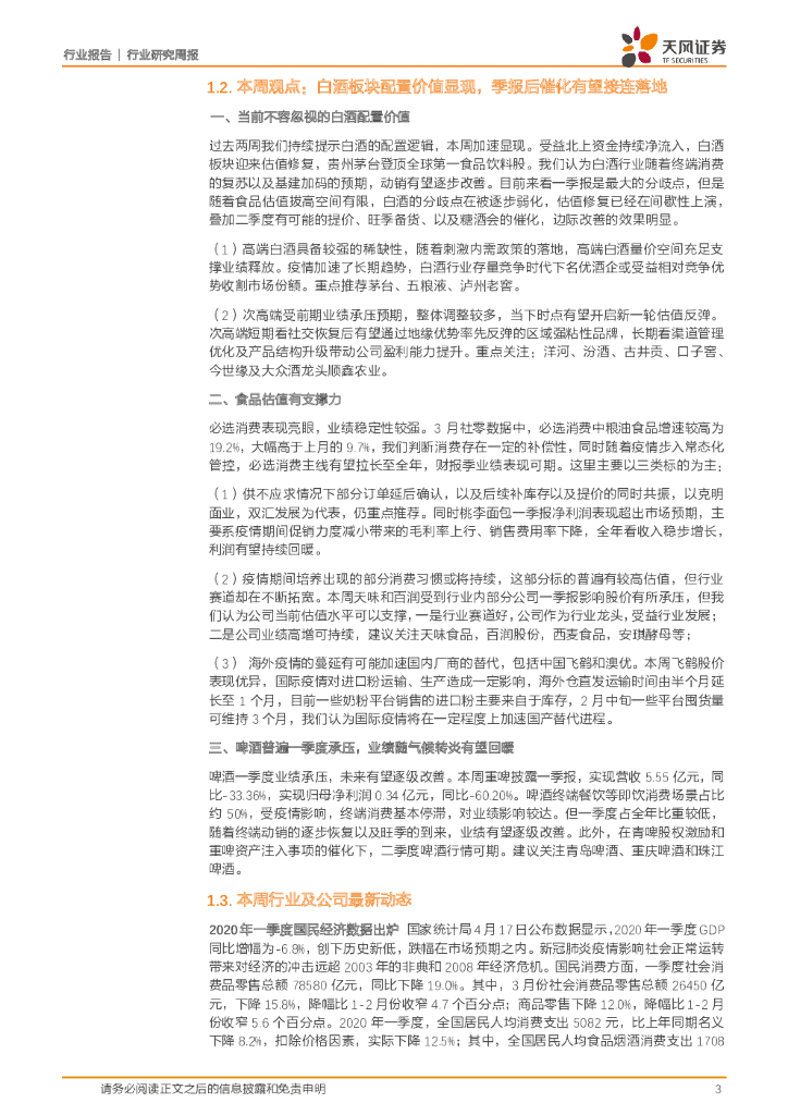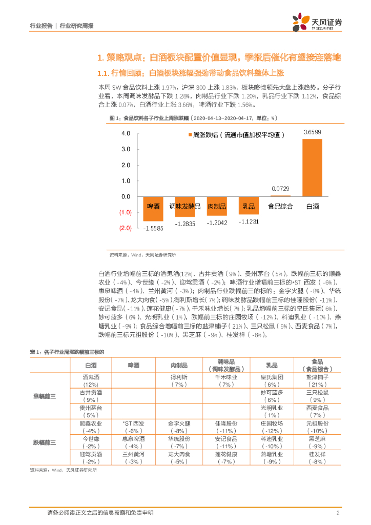 天风证券:食品饮料行业研究周报:白酒板块配置价值显现,季报后催化有望接连落地.pdf