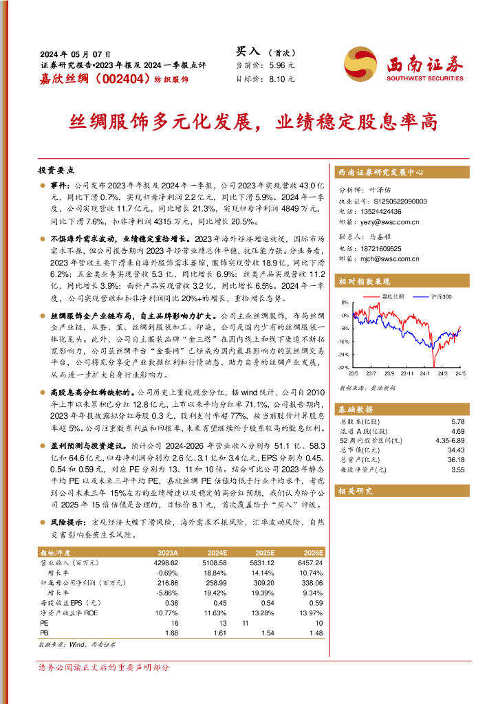 西南证券:嘉欣丝绸(002404)-丝绸服饰多元化发展,业绩稳定股息率高.pdf