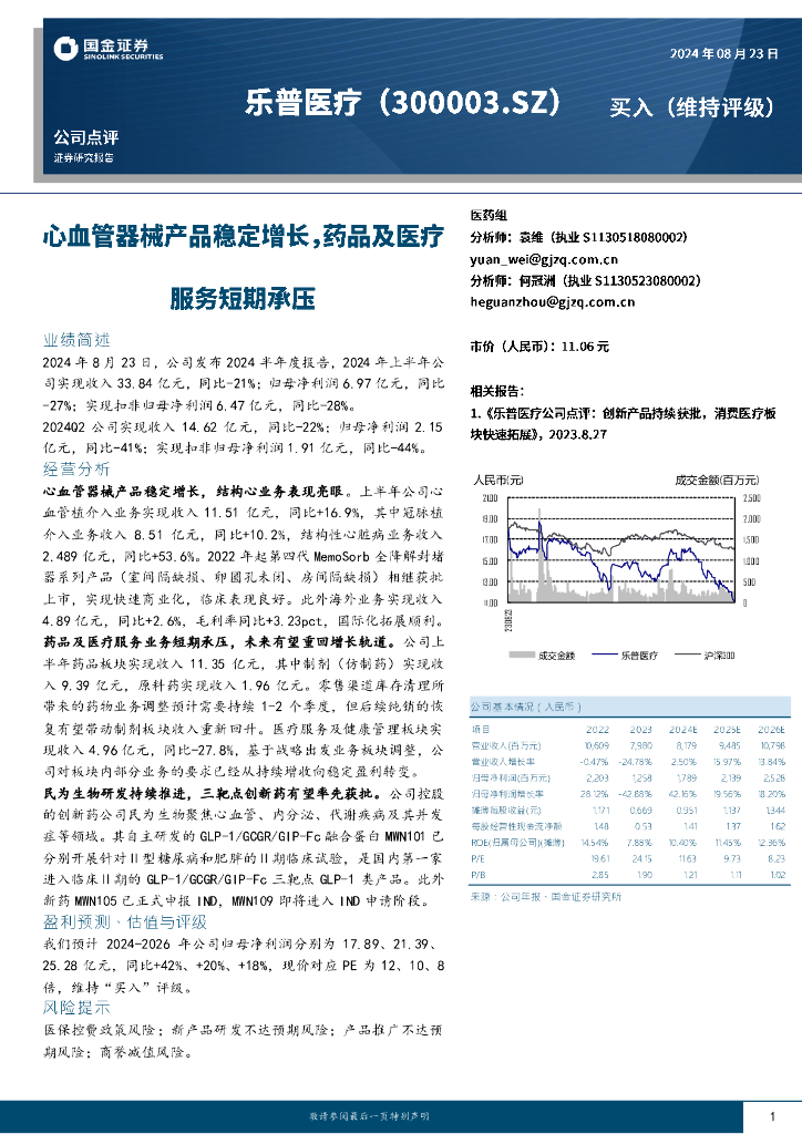 国金证券:乐普医疗(300003)-心血管器械产品稳定增长,药品及医疗服务短期承压.pdf
