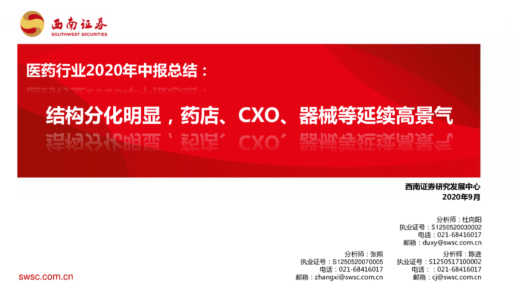西南证券:医药行业2020年中报总结:结构分化明显,药店、CXO、器械等延续高景气.pdf