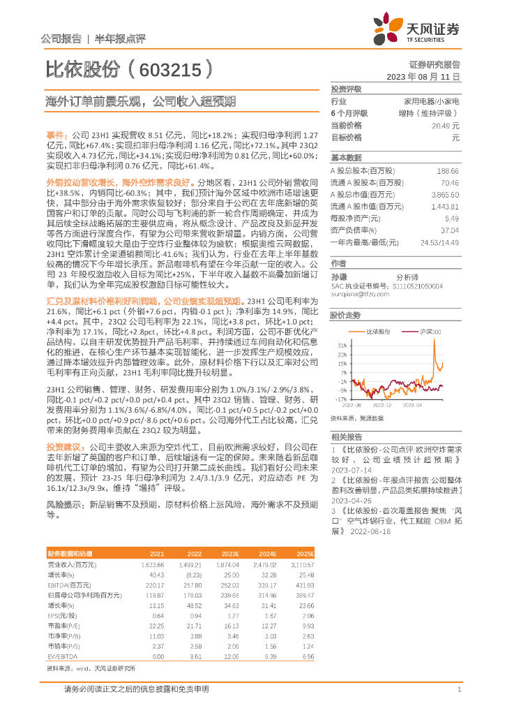 天风证券:比依股份(603215)-海外订单前景乐观,公司收入超预期.pdf
