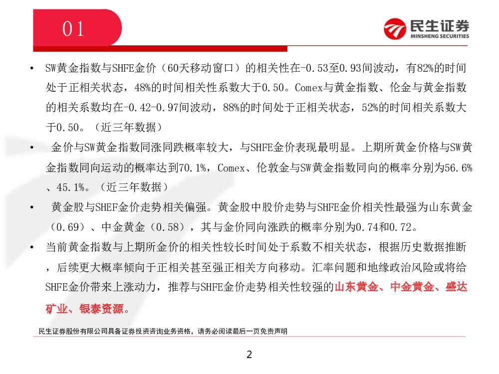 民生证券:【民生有色】SHFE金价与黄金指数多数时间强正相关,建议关注SHFE金价与黄金股联动关系.pdf