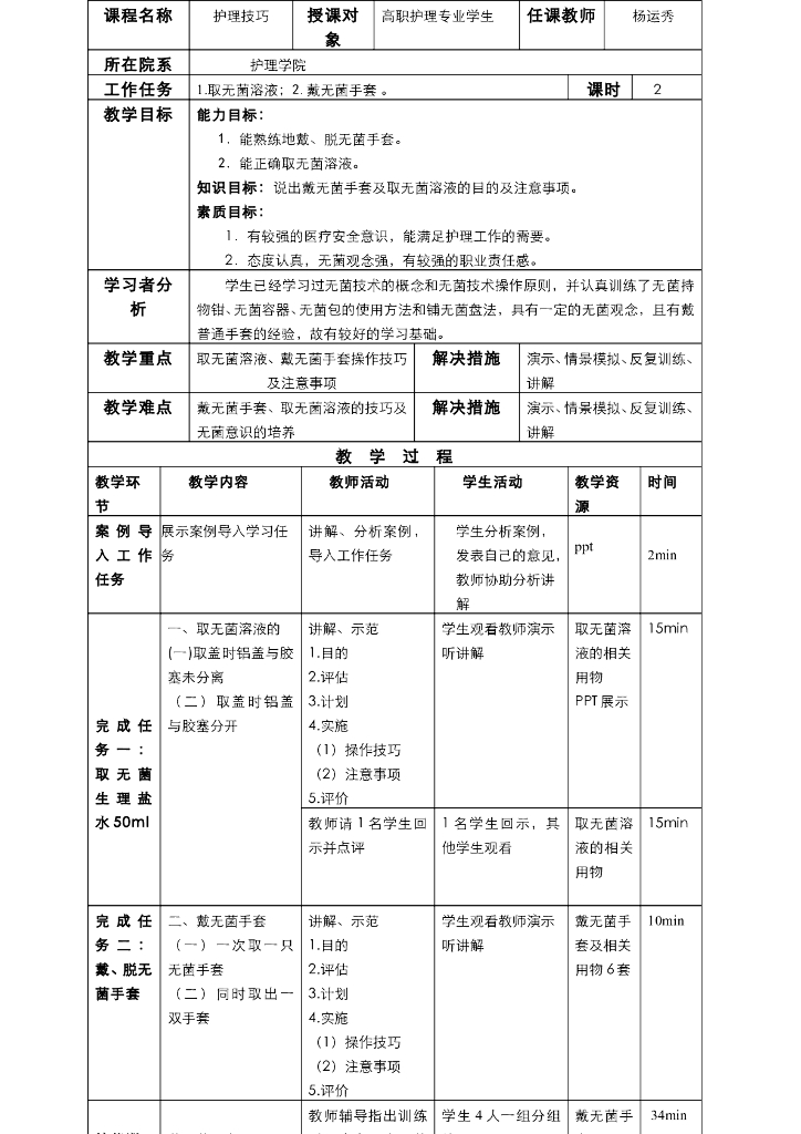 《护理技巧》电子教案-子任务三 取无菌溶液、子任务四 戴无菌手套.pdf