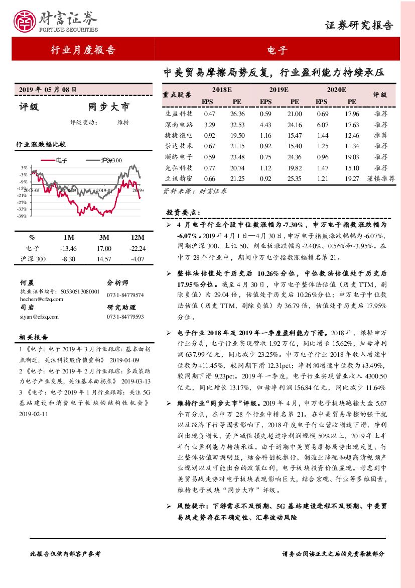 财富证券:电子行业月度报告:中美贸易摩擦局势反复,行业盈利能力持续承压.pdf