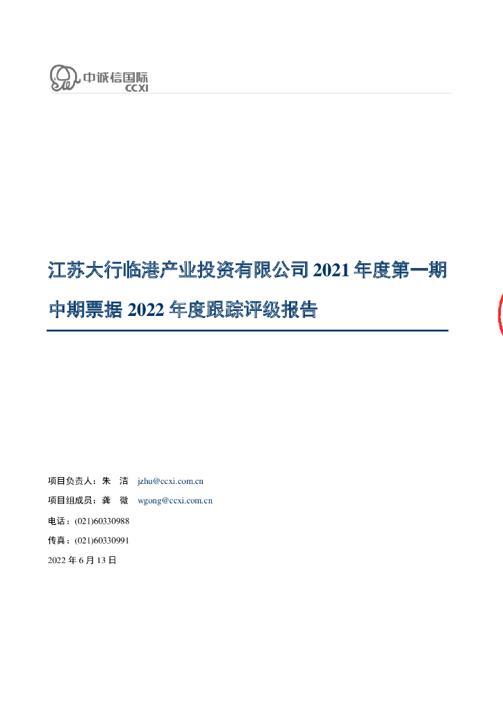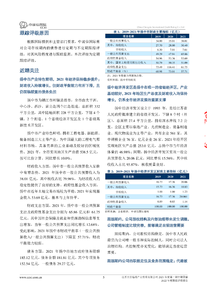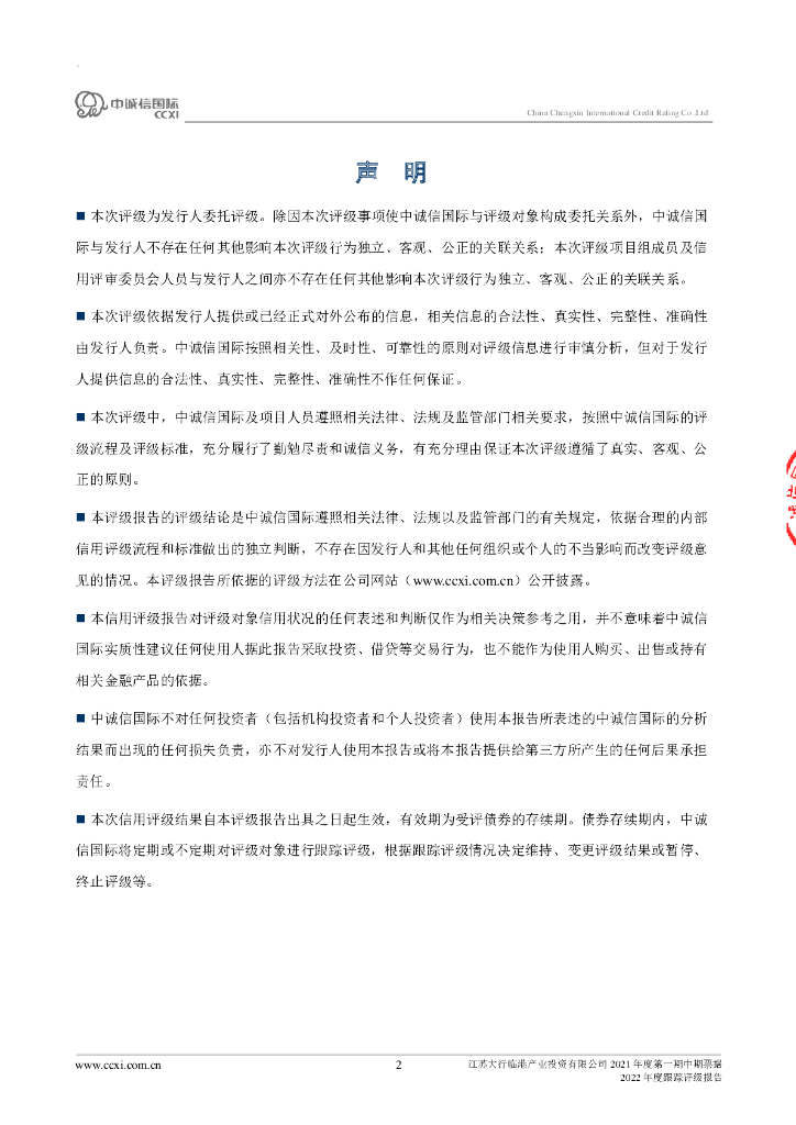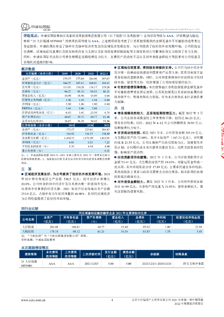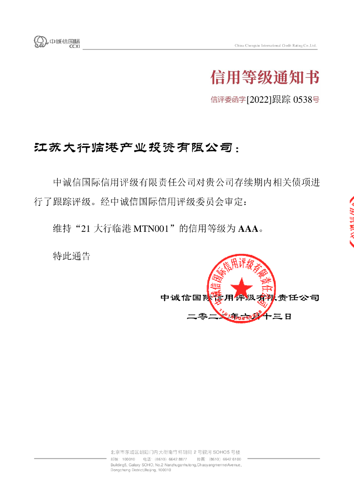 中诚信:江苏大行临港产业投资有限公司2021年度第一期中期票据2022年度跟踪评级报告.pdf